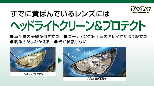 キーパーのヘッドライトクリーン&プロテクトはヘッドライトの黄ばみ・クスミを除去しコーティングする事により、新車のような輝きを取り戻します。